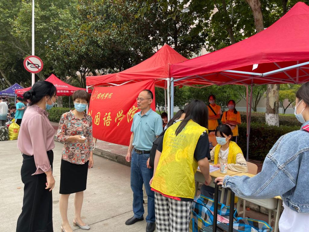 8月29日,外国语学院2021级专升本新生报到日。学院党委副书记、院长张雁凌、党委副书记(临时负责)郝景东、团总支书记宋皓、辅导员徐国庆、余阳等在迎新接待点迎接新生的到来。