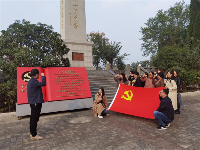 在庄严肃穆的烈士纪念碑前,各个支部的党员面对鲜艳的党旗,重温入党誓词,用铮铮誓言表达坚决听党话、跟党走、坚定共产主义理想的信念和决心。
