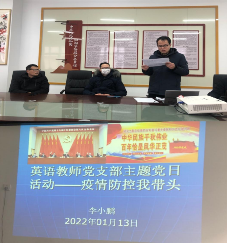 当前新冠肺炎变异毒株肆虐世界,国内疫情出现反弹,多个城市陆续出现奥密克戎毒株的传播。随着中国传统节日春节的临近,人口流动巨大,防疫形势变得十分严峻。为配合完成中央和地方关于春节疫情防控的工作部署,2022年1月13日下午,外国语学院英语专业教师支部在西区计算机楼307会议室开展“疫情防控我带头”的主题党日活动。活动由支部书记李小鹏主持,支部全体党员参加。