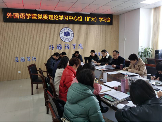 2月28日下午,外国语学院在逸夫楼A318会议室召开了党委理论学习中心组(扩大)学习会,学院党委委员、科级以上干部及教研室主任参加,会议由党委书副书记(临时负责)郝景东主持。