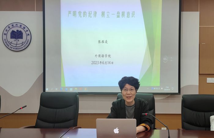 为深入学习贯彻党的二十大精神,推动学习贯彻习近平新时代中国特色社会主义思想主题教育走深走实,6月14日下午,外国语学院党委副书记、院长张雁凌教授以“严明党的纪律、树立一盘棋意识”为主题,在逸夫楼一楼会议室为大学英语支部党员讲授党课。