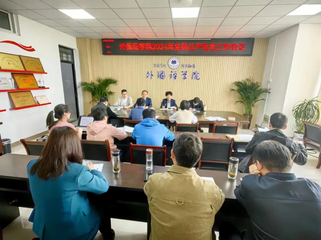 4月22日下午,外国语学院在逸夫楼318会议室召开2024年全面从严治党工作会议。学院党委委员、科级以上干部、各党支部书记、教研室主任参加会议,会议由党委书记郝景东主持。
