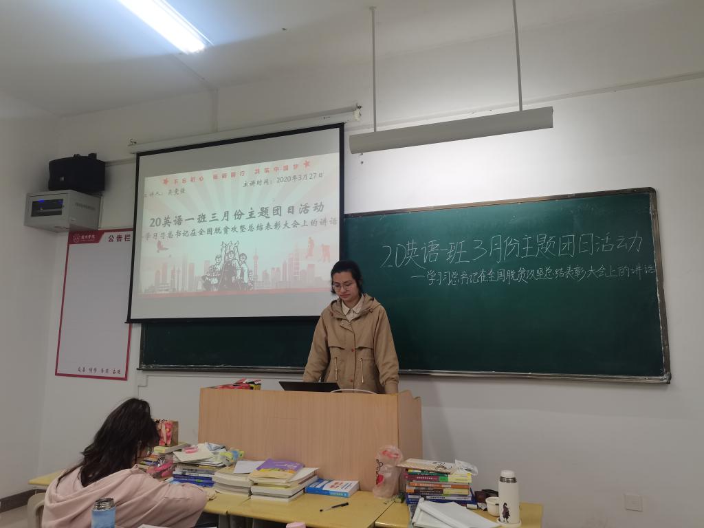 2021年3月27日晚7:00,在20级英语1班于逸夫楼Al05教室,由团支书吴雯佳组织班级全体同学在教室开展了主题团日活动。