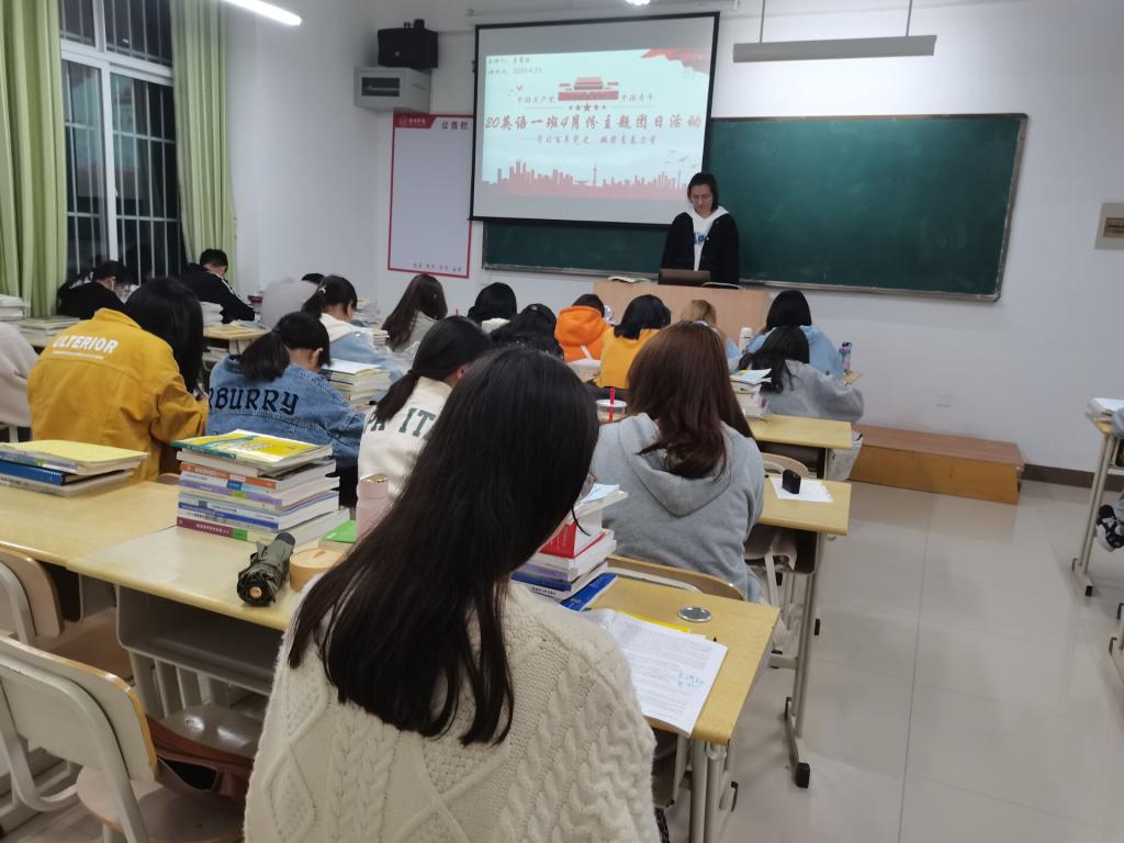 2021年4月25日晚7:00,在20级英语1班于逸夫楼Al05教室,由团支书吴雯佳组织班级全体同学在教室开展了主题团日活动。