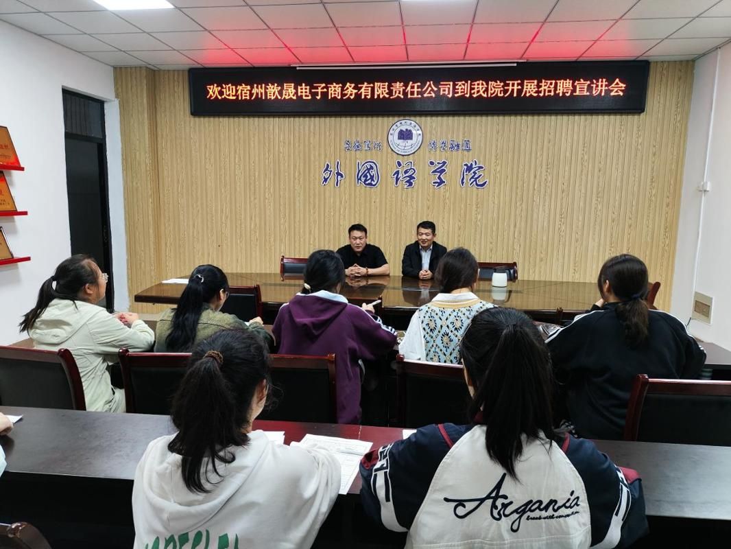 为做好2026届毕业生就业工作,外国语学院于10月13日在逸夫楼A318会议室举办英语专业专场招聘会,招聘单位为宿州歆晟电子商务有限责任公司。院长胡永近主持招聘会,毕业班辅导员和20名毕业班学生参加会议。
