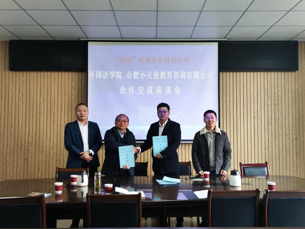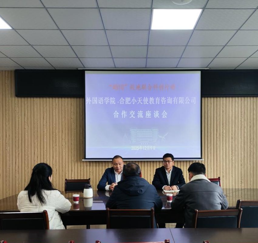 12月9日,外国语学院与合肥小天使教育咨询有限公司“4510”校地联合科创行动合作交流座谈会顺利举行,双方代表现场参与交流并推进合作事宜。