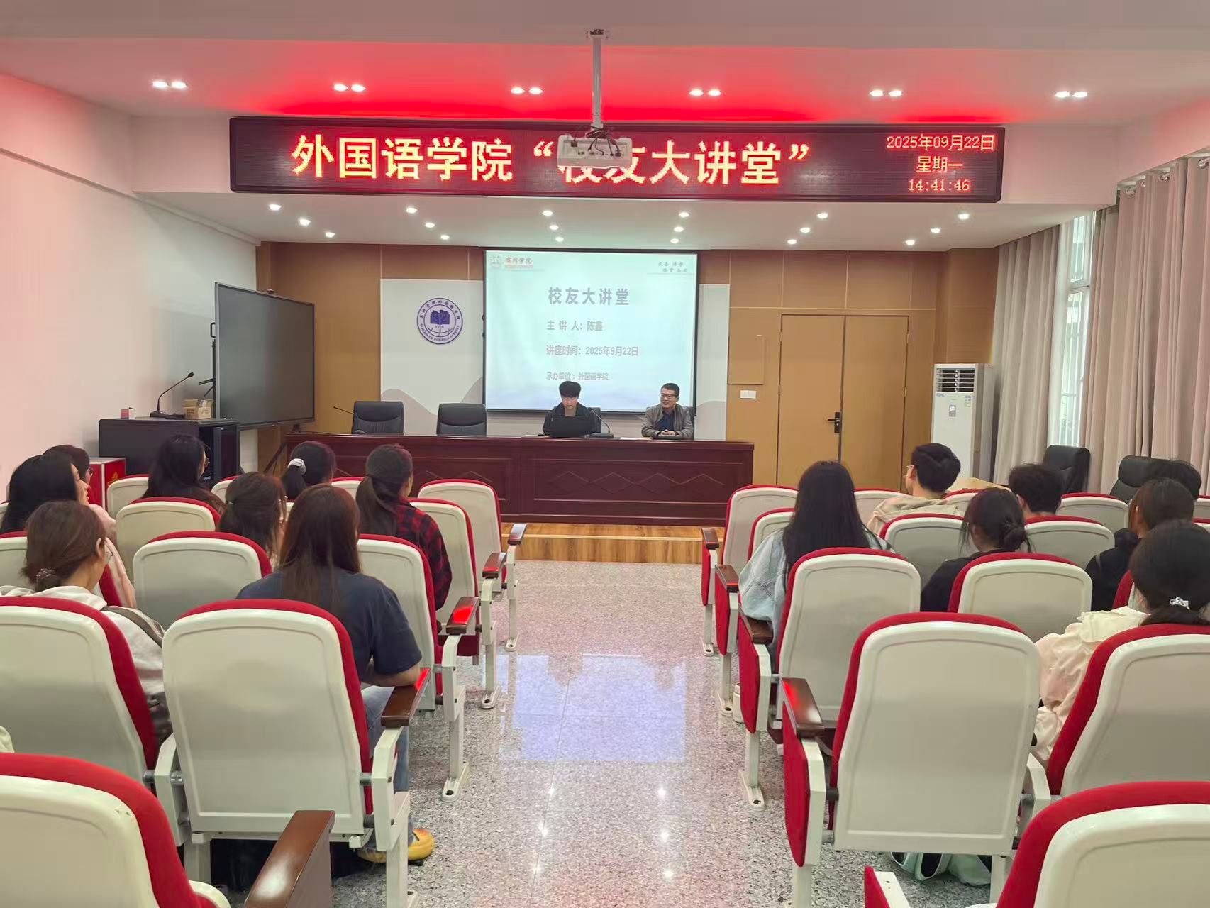 9月22日下午,外国语学院邀请优秀校友陈鑫返校,成功举办了一场主题为“从校园到社会的创业之路”的“校友大讲堂”分享会。外国语学院院长胡永近担任主持人,学院22级、23级部分学生代表现场聆听了分享。