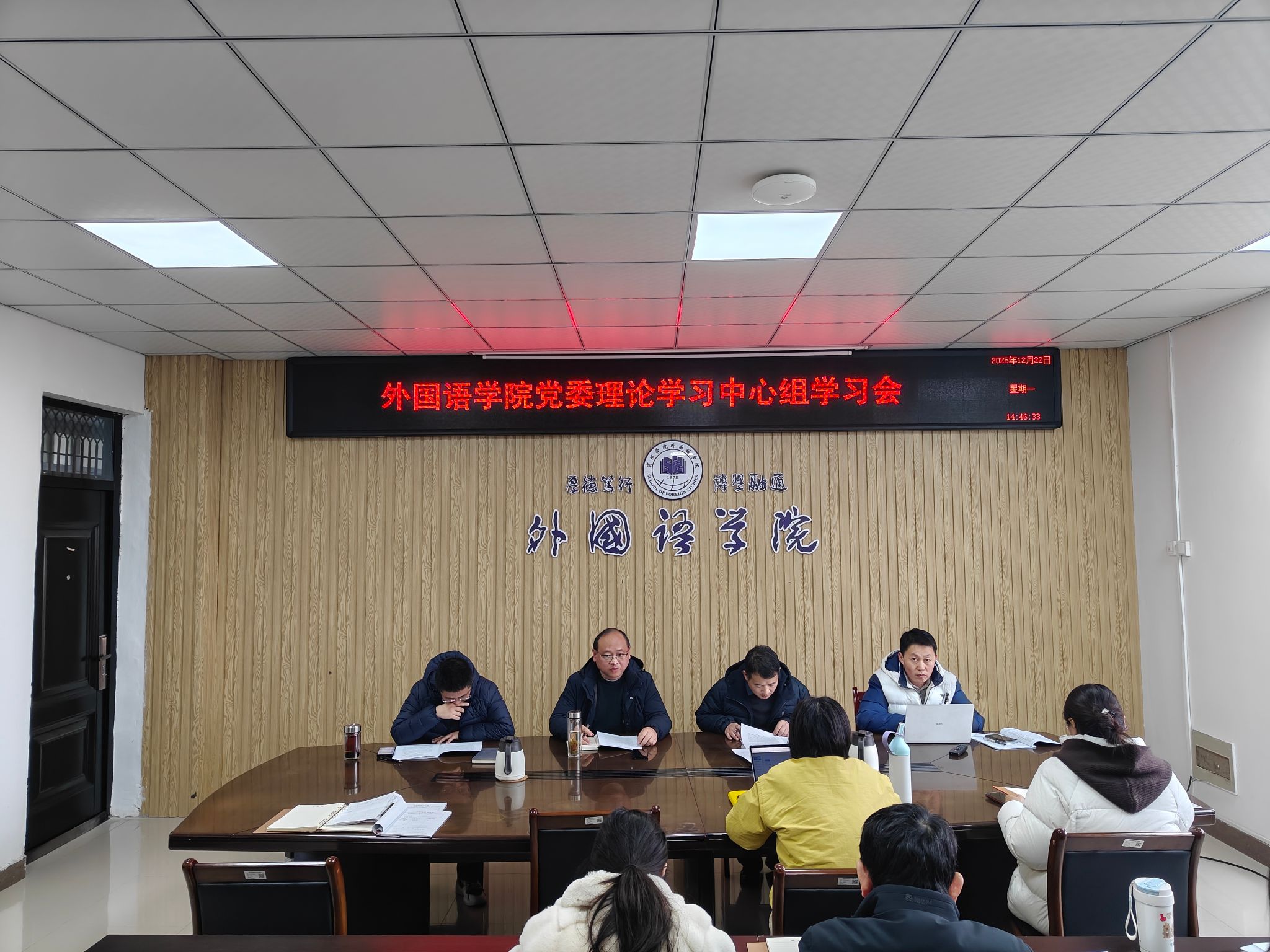 2025年12月22日下午,外国语学院在逸夫楼A318会议室召开党委理论学习中心组学习会,学院党委委员、科级干部及党支部书记参会,党委书记王金岭主持。
