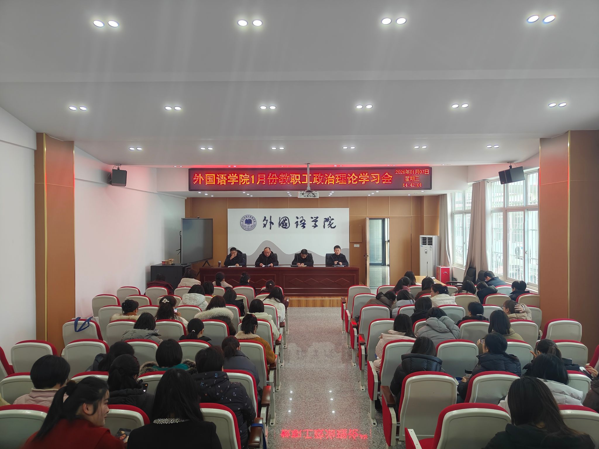 2026年1月7日下午,外国语学院于逸夫楼一楼会议室召开1月份教职工政治理论学习会,学院全体教职工参会,党委书记王金岭主持会议。