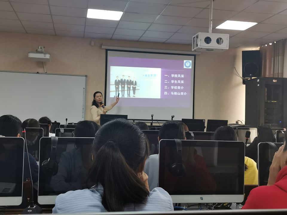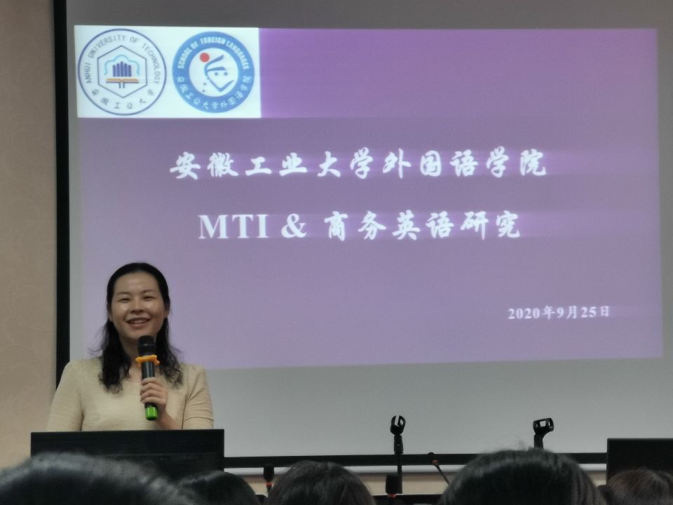 曹教授从学院风采、学生风采、学院简介、马鞍山地区简介四方面进行详细阐述,着重对近些年安徽工业大学外国语学院研究生院的各方面发展向同学们做详细介绍。曹教授表示,安徽工业大学外国语学院研究生院主攻MTI及商务英语研究。其中MTI自2017年创立以来,规模迅速扩大。商务英语研究作为研究生院优势学科,师资力量及教学设备在省内名列前茅。MTI专业学生先后在各种重大会议担任口译员工作,并斩获各类奖项。商务英语研究专业学生毕业后分赴各大重要岗位,在各大领域展露头角。