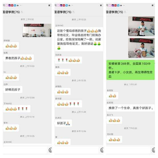 得知刘畅同学成功捐献造血干细胞后,外国语学院副书记、副院长郝景东代表学院通过电话和微信向他表示了慰问,学院的师生们也都为他感到骄傲,纷纷给他点赞。