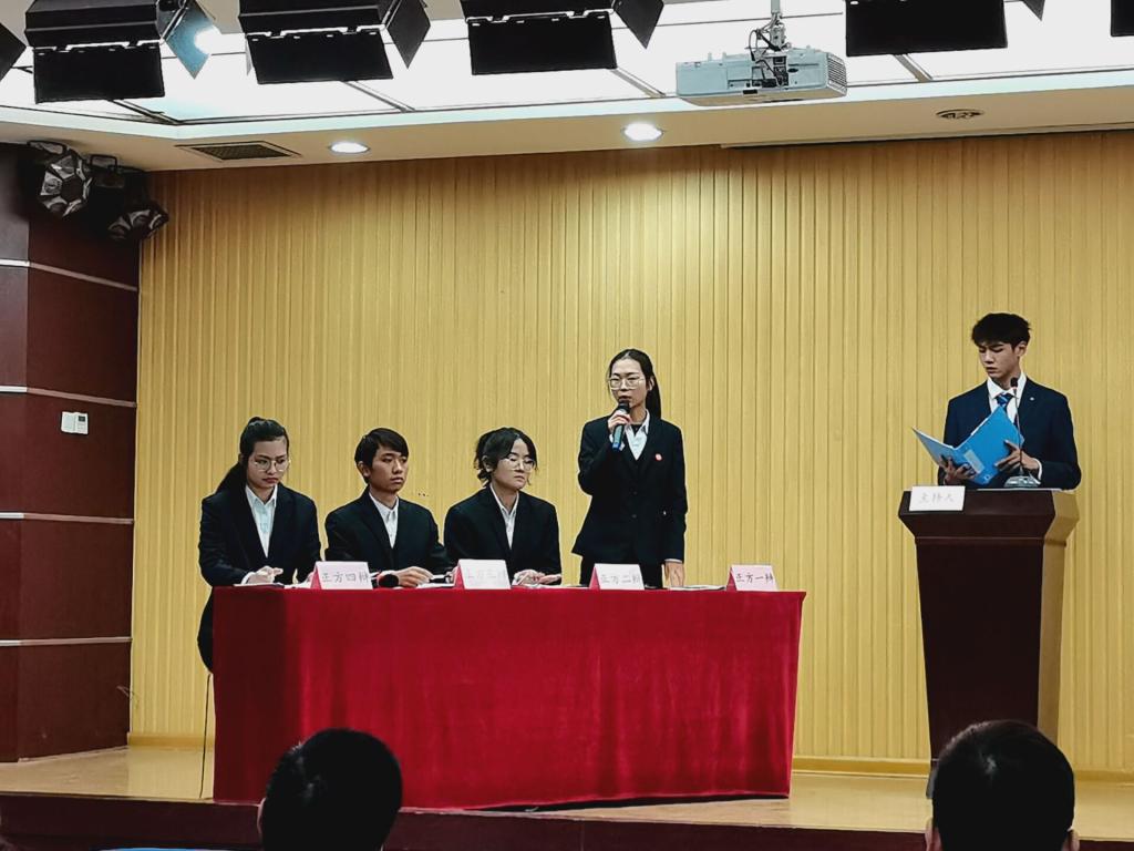 比赛开始前,双方辩手握手示好并进行具有外国语学院外语学习者特色的自我介绍。外国语学院的参赛选手为一辩杜子晗,二辩蒋雨欣,三辩陶银,四辩吴雯佳。主持人宣布辩论赛开始后,双方辩手各执己见,展开激烈辩论,场面气氛逐渐热烈。