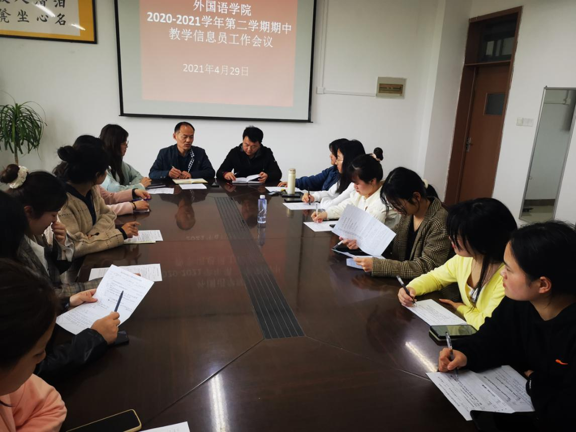 为了充分发挥学生参与教学管理的主体作用,促进教学质量监控和信息反馈,4月29日中午,外国语学院在逸夫楼A318召开了期中教学信息员会议。会议由外国语学院副书记、副院长郝景东主持,教学秘书王培培和各班教学信息员全部参加。