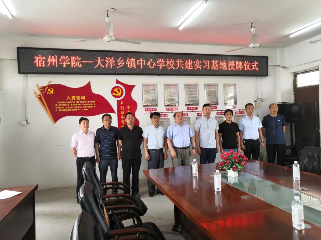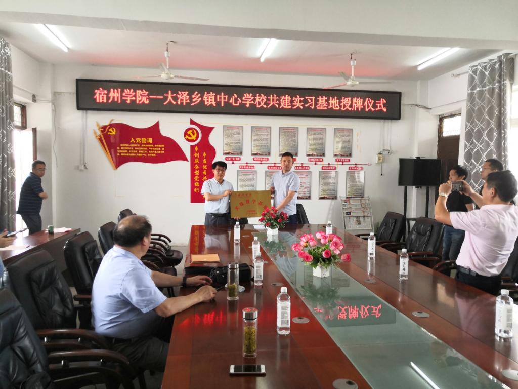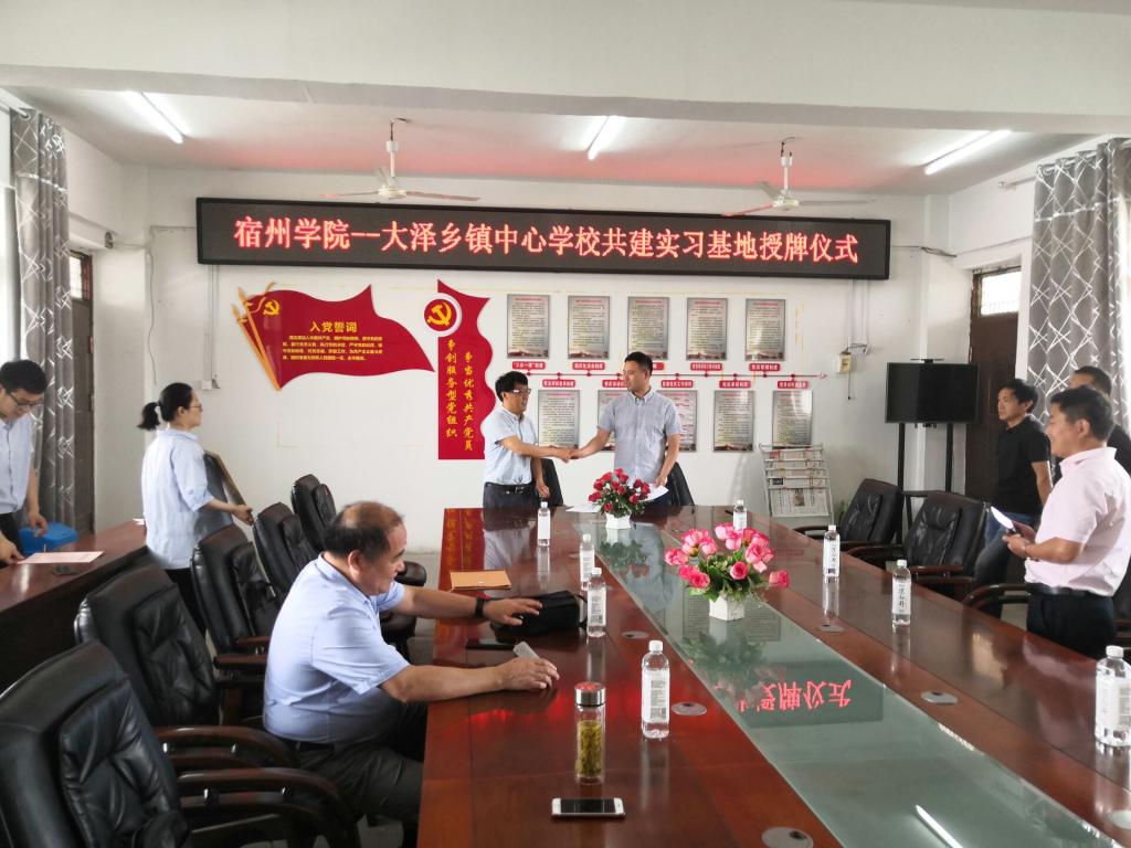 2021年6月7号上午,宿州学院外国语学院院长李加强、教学科研秘书王培培与数统学院院长宁群、学校办公室副主任张海洋一行赴大泽乡中心校就设立校企合作实践(实训)基地进行签约仪式,并现场授牌。会上,大泽乡中心校班子向宿州学院一行详细介绍了学校的基本情况以及学校对于实习实训工的现状,表达了对建立校企共建实习实训基地的强烈愿望。张海洋就宿州学院现阶段的发展进行了讲解,从学校服务地方的实际出发,向参会人员进行了详细的说明。李加强、宁群分别从各自学院的专业实际出发,对师范生培养、实习实训阶段和要求进行了细致讲解。他们对大泽乡中心校提供的方方面面的安排给予了肯定,对双方能够为大学生实习就业提供平台做出共同努力给予肯定。随后,双方签订合作协议并进行校企合作基地挂牌仪式。