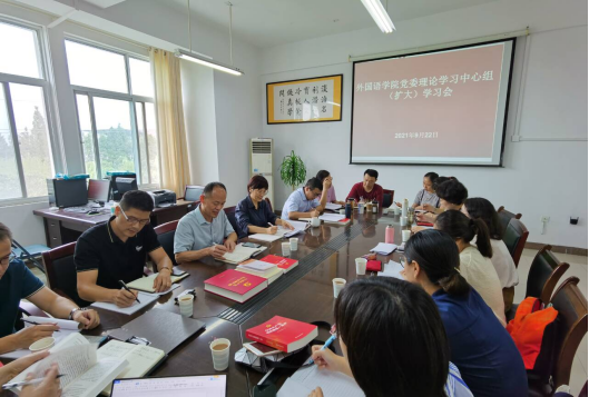 9月22日下午,外国语学院在逸夫楼A318会议室召开了党委理论学习中心组(扩大)学习会,组织开展党史专题教育学习。学院党委委员、科级以上干部和教研室主任参加,会议由党委副书记(临时负责)郝景东主持。
