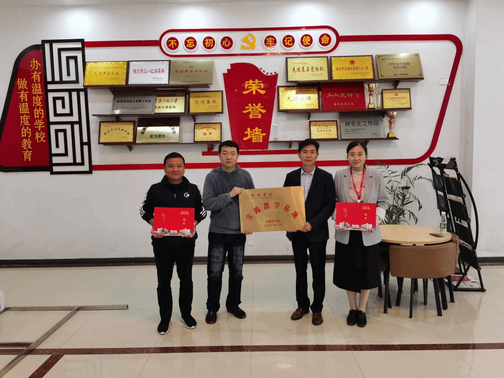 王培培代表学院与宿州格瑞学校签署了实践基地协议并举行了揭牌仪式。会上为英语教师代表颁发了“实习+论文”双导师聘书。