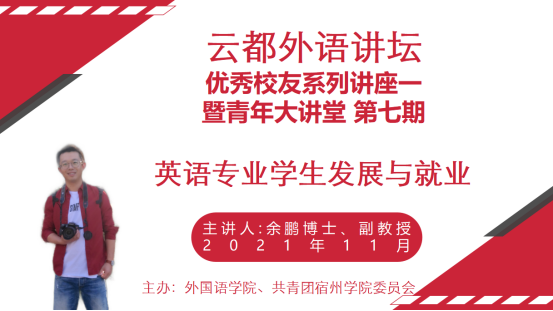 为进一步帮助学生做好人生规划设计,提升专业素质和就业能力,外国语学院于11月18日下午在一楼会议室举办题为“英语专业学生专业发展与就业”的宿州学院青年大讲堂第七期专场讲座,主讲人余鹏博士也是云都外语讲坛优秀校友系列专题的首场受邀主讲人。讲座由外国语学院学生事务管理科宋皓老师主持,校团委书记凌峰视频参会并致辞。