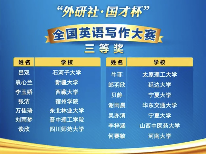 12月10日,全国2021“外研社·国才杯” (Uchallenge)大学生英语挑战赛圆满落幕。在写作大赛中,我校外国语学院张洁同学在高手云集的100多名国赛决赛选手中获得全国三等奖。