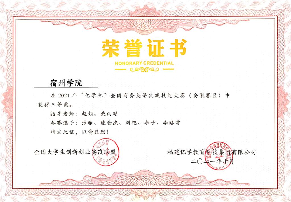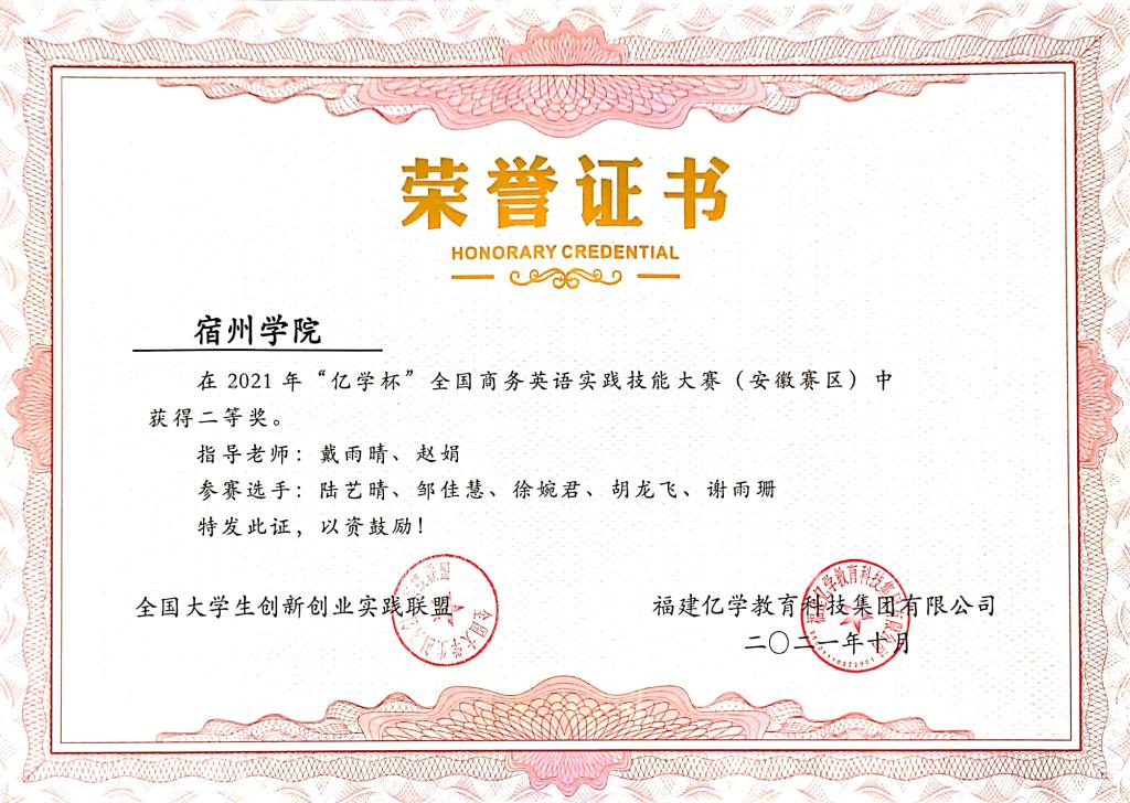 2021年安徽省“亿学杯”商务英语实践技能大赛由全国大学生创新创业实践联盟、福建亿学教育科技集团有限公司主办,安徽省外国语言文学学会联合主办,安徽三联学院承办。经过各高校初赛选拔,共有来自安徽省内17所高等院校的30支队伍共129名学生参与角逐。由宿州学院外国语学院陆艺晴、邹佳慧、徐婉君、胡龙飞和谢雨珊组成的“Best小分队”荣获省级二等奖,张雅、连会杰、刘艳、李子、李路雪组成的“Miracle队”荣获省级三等奖。