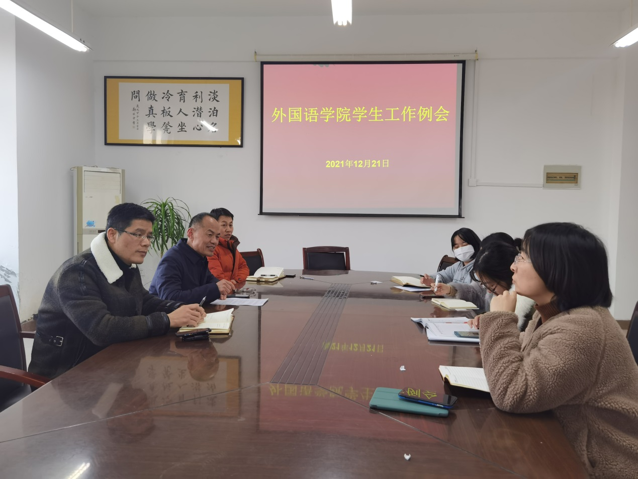 为做好学期末学生工作,严肃考风考纪,营造公平公正的考试环境,进一步激发同学们的备考积极性,12月21日下午,外国语学院召开学生工作和学生考风考纪专题会议,党委副书记、纪委书记张亚锋和全体辅导员、班主任参加会议。院党委副书记(临时负责)郝景东主持会议并做工作部署。