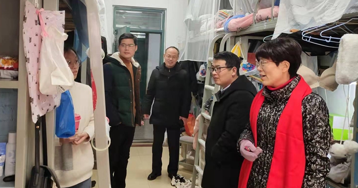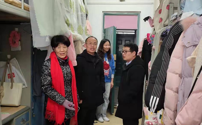 在2021年第一学期期末考试即将结束之际,外国语学院领导班子张雁凌、郝景东、胡永近、张亚锋深入学生宿舍,了解学生学习及生活状况并实地检查指导疫情防控工作。