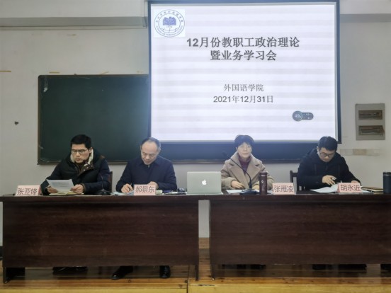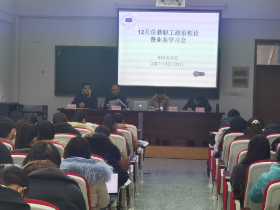 12月31日下午,外国语学院在逸夫楼一楼报告厅召开12月份政治理论暨业务学习会,外国语学院全体教师参加大会。会议由党委副书记(临时负责)郝景东主持。