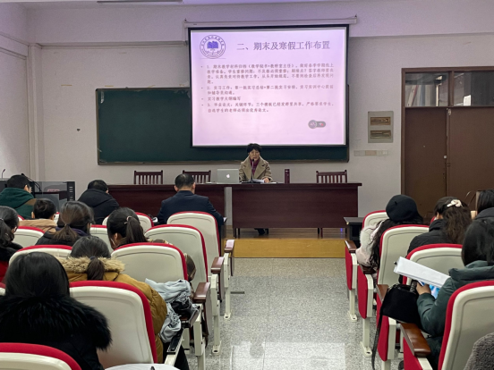 接着,张雁凌就期末和寒假工作进行了具体布置。教学方面要做好期末教学材料归档工作、做好春季学期线上教学准备;实习实训中心提前做好第二批次实习准备工作;各指导老师假期里做好论文指导工作,严把关,出成绩;全体教职工都要利用假期时间写论文、报项目,提升个人科研能力水平;人人参与师范专业认证工作,尽职尽责编写课程教学大纲。