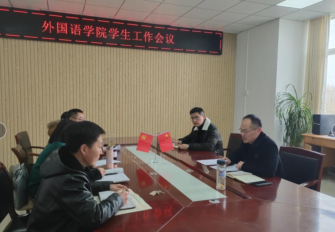 3月1日下午,外国语学院在逸夫楼A314会议室召开春季学期第二周学生工作会议,会议由院党委副书记张亚锋主持,副书记(临时负责)郝景东和全体学生工作团队成员参加了会议。