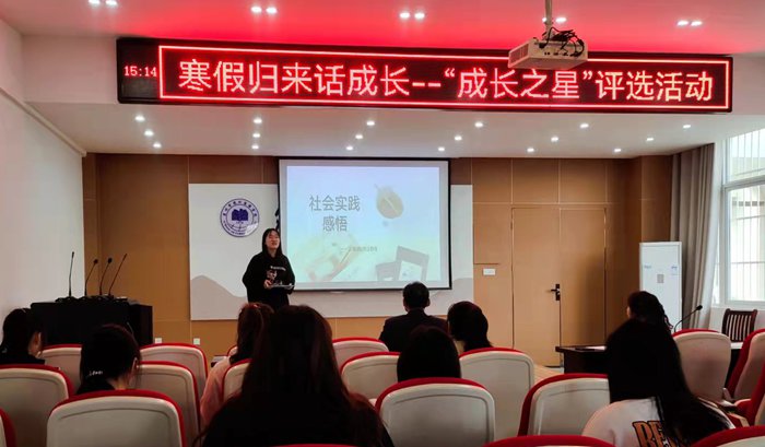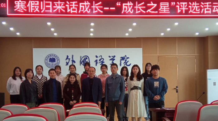 为落实“立德树人”根本任务,推进“三全育人”综合改革试点工作走深走实,确立“大党建、大学工、大思政”工作框架下的指导思想,外国语学院于3月15日下午在逸夫楼一楼会议室举办了“寒假归来话成长”成长之星评选活动。校团委副书记陈宇、外国语学院党委副书记(临时负责)郝景东、副书记张亚锋和团委书记赵婷婷担任评委;学生事务管理科宋皓主持评选活动。