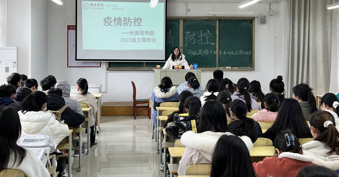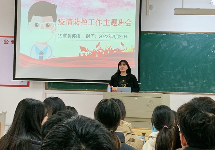 当前,疫情防控形势严峻复杂,为认真贯彻落实学校疫情防控调度会精神,进一步增强学生的疫情防控意识,提升个人防控能力,3月22日,外国语学院组织各班开展了疫情防控主题班会活动。