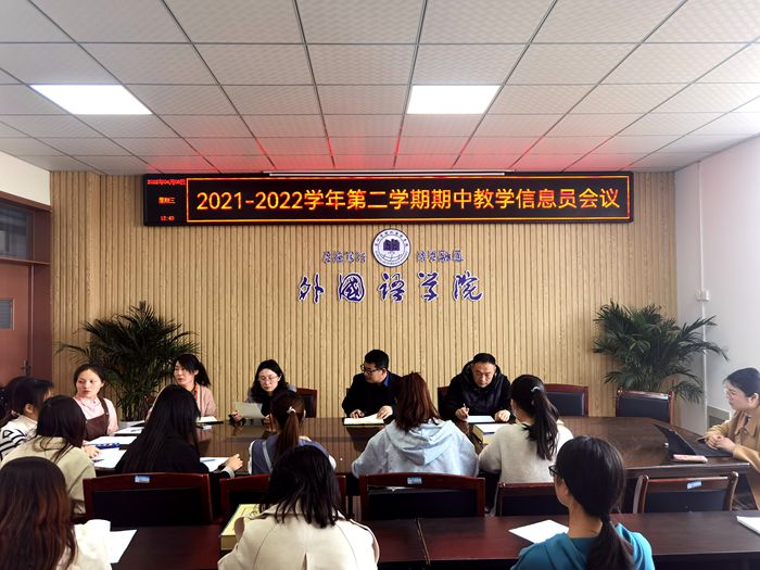 4月6日中午,外国语学院在逸夫楼A318会议室召开2021-2022学年度第二学期期中教学信息员会议。参加本次会议的人员有外国语学院副院长胡永近、学院教学督导组组长李晓璇、教学督导组成员宗蔚、刘军、教务员刘玮以及各班教学信息员。会议由胡永近主持。