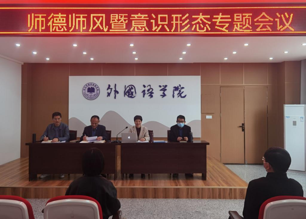 为了进一步落实意识形态责任,推进师德师风建设工作,强化教师纪律意识,规范从教行为,提升职业道德素养,4月13日下午,外国语学院召开意识形态和师德师风警示教育大会。学院班子成员、全体教职工参加会议。
