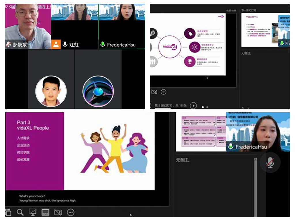 主持人介绍嘉宾后活动开始,郝景东介绍了宿州学院与外国语学院的办学特色与毕业生情况,徐晴展示了荷贝(宁波)信息服务有限公司的发展动态与用人需求;之后,双方通过网络平台开展问答式对接。