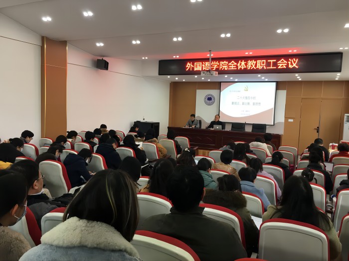 12月7日下午,外国语学院召开政治理论学习会,专题学习党的二十大精神,院长张雁凌、副书记张亚锋、副院长胡永近以及全体教职工参会。会议由党委副书记(临时负责)郝景东主持。