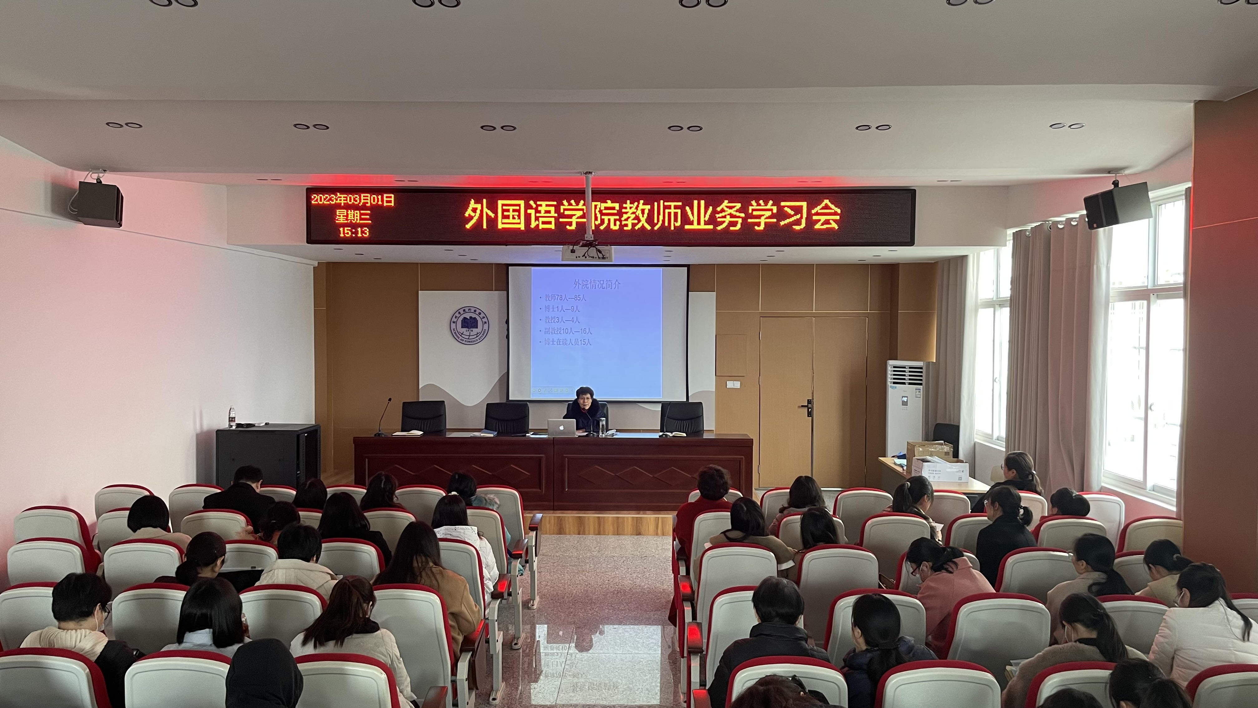 3月1日下午,外国语学院召开新学期教师业务学习会,党委书记郝景东、院长张雁凌、党委副书记张亚锋、副院长胡永近及全体教职工参加大会 。