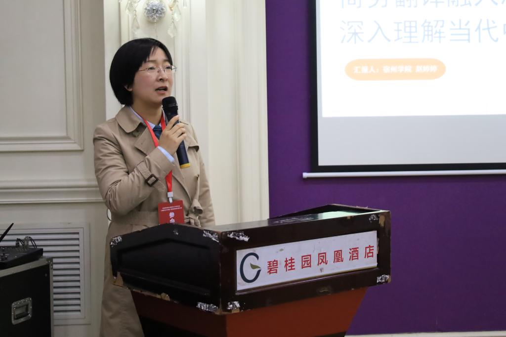 来自池州学院、安庆师范大学、淮南师范学院的专家教授在下午分别作了主旨报告,外国语学院教师赵婷婷也在英语类专业分论坛作了题为“商务翻译融入思政元素,深入理解当代中国”的交流发言。赵婷婷介绍了我院商务英语翻译课程的建设情况,结合实际教学案例,分享了课程思政元素融入商务翻译实践全过程的实施方案,旨在帮助学生全方位更加深刻的理解当代中国发展,坚定拥护“两个确立”、坚决做到“两个维护”。