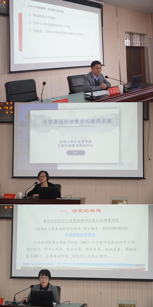 在会议主旨报告环节,河南安阳师范学院外国语学院院长祁金善教授、江南大学外国语学院/江南外语教学研究中心顾琦一教授、安徽科技学院外国语学院院长刘萍教授分别作了题为《关于大中小外语教育一体化的思考》《中学英语阅读教学与教师发展》《基于高质量发展的乡村外语教师队伍建设——教育振兴支撑乡村振兴视角》主旨报告。
