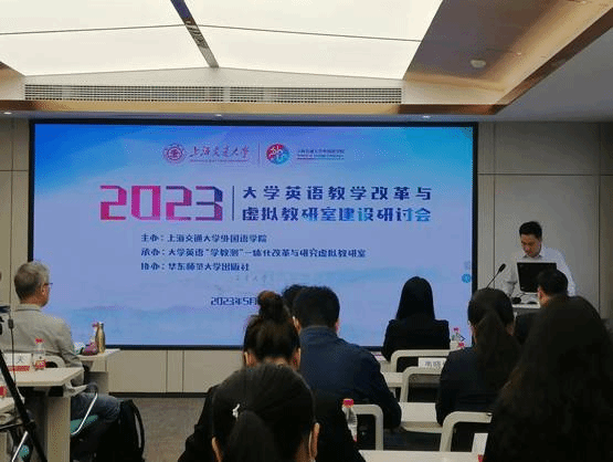2023大学英语教学改革与虚拟教研室建设研讨会于5月20日在上海交通大学举行。本次研讨会由上海交通大学外国语学院举办,大学英语“学教测”一体化改革与研究虚拟教研室承办,华东师范大学出版社协办。来自上海交通大学、上海外国语大学、南京大学等高校的五十多名专家、学者和一线教师参加会议。我院大中小外语教育一体化虚拟教研室成员谢冰和孙二平老师参加会议。