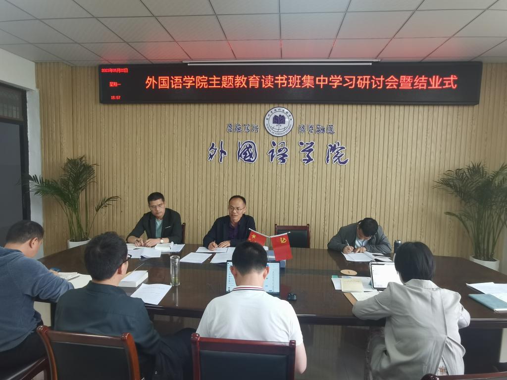 5月22日下午,外国语学院在逸夫楼318会议室举办学习贯彻习近平新时代中国特色社会主义思想主题教育读书班集中学习研讨会暨结业仪式,学院读书班全体成员参加。党委书记郝景东主持结业仪式。