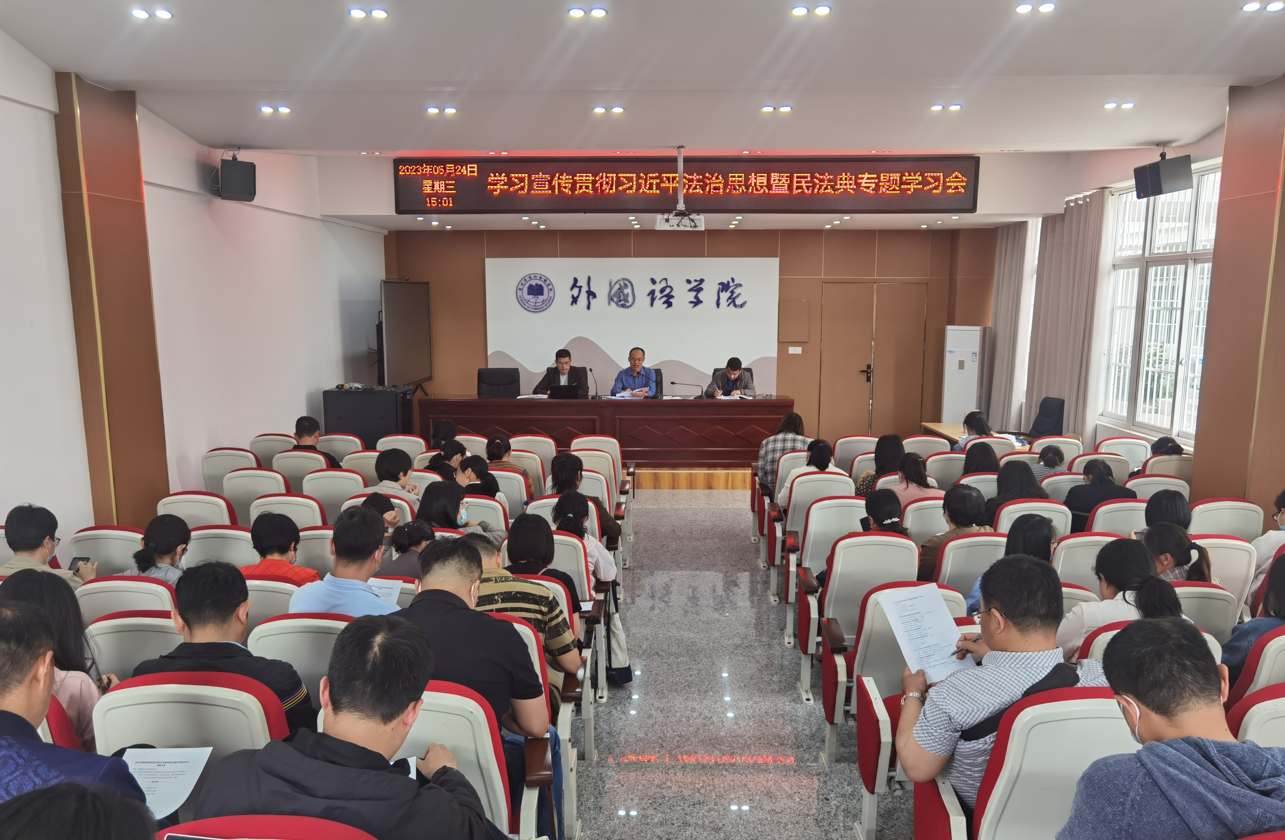 为贯彻落实《安徽省教育厅关于开展民法典宣传月活动的通知》(皖教秘政法〔2023〕35号)精神,以及全国“八五”普法规划关于“以‘美好生活·民法典相伴’为主题,组织开展民法典主题宣传”的部署要求,提升教师对民法典的认识,积极营造知法、守法的良好氛围,外国语学院于5月24日下午召开了学习宣传贯彻习近平法治思想暨民法典专题学习会,全体教职工参加,会议由党委书记郝景东主持。