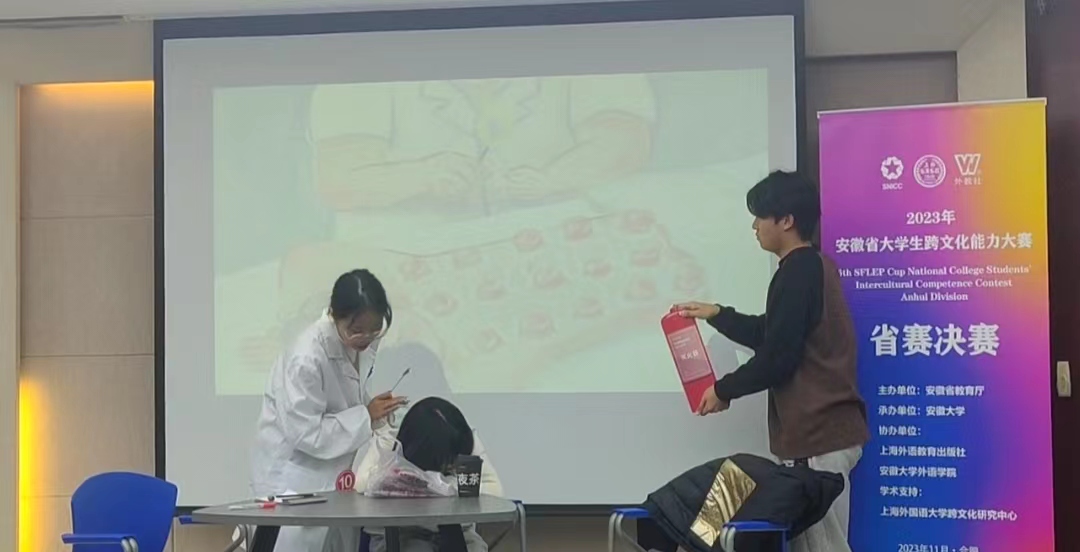 “安徽省大学生跨文化能力大赛”由安徽省教育厅主办,安徽大学承办,上海外语教育出版社协办。为全面深化新时代外语教育改革和外语课程思政建设,决赛环节包括跨文化冲突案例开发与展析、回答评委提问和讲述中国故事三项内容。在跨文化冲突案例开发与展析环节中,选手需要运用跨文化交际相关的概念和理论,对案例中的跨文化现象和交际策略进行深入分析,展现分析和解决问题的能力。在回答评委提问环节中,团队需要对评委提出的问题进行准确、清晰的回答,展现思维敏捷和语言表达能力。在讲述中国故事环节中,选手根据组委会提供的情景问题阐述观点,展示对中国文化、安徽地域文化和中外文化交流的理解和表达能力。评委根据团队的合作表现、案例分析能力、解决问题的能力进行评分。