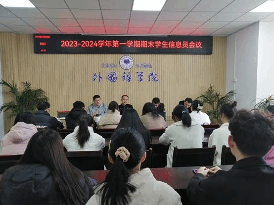 为充分发挥学生参与教学管理的主体作用,促进教学质量监控和信息反馈,外国语学院于2023年12月6日中午12:30在逸夫楼A318会议室召开2023-2024学年第一学期期末教学信息员会议。会议由外国语学院副院长胡永近主持,党委书记郝景东、副书记张亚锋、实习实训中心主任王培培以及各班教学信息员参会。