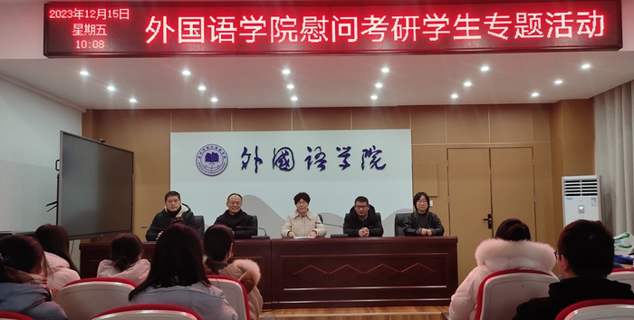 为进一步鼓舞考研学子士气,帮助考研学生缓解备考压力,坚定考研信心,以更好的状态迎接2024年全国硕士研究生考试,外国语学院领导班子和毕业班辅导员于12月15日上午在一楼会议室为考研学生送上暖心礼包与祝福。