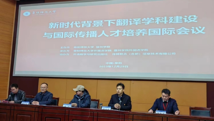 为贯彻落实党的二十大精神,推进翻译学科建设和国际传播人才培养,12月29日,宿州学院与阜阳师范大学共同主办的“新时代背景下翻译学科建设与国际传播人才培养”国际会议在阜阳成功举办。会议由宿州学院外国语学院、阜阳师范大学外国语学院共同承办,外语教学与研究出版社、传神联合(合肥)信息技术有限公司协办。宿州学院党委委员、副校长杨维志,以及阜阳师范大学党委书记程曦、安徽省外国语言文学学会秘书长曹军出席会议,来自国内外翻译领域的专家学者共50余人参加会议。