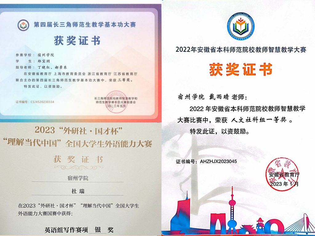 学院紧抓教学工作重点,以提高教学质量为目标, 以规范教学管理为手段,切实提升教师教学水平。鼓励师生参与各类教学比赛、能力竞赛,达到以赛促学、以赛促教和以赛促改的目标。培养学生扎实的专业功底、过硬的教学技能和较高的专业素养。外国语学院师生在各类比赛中获得优异的成绩。
