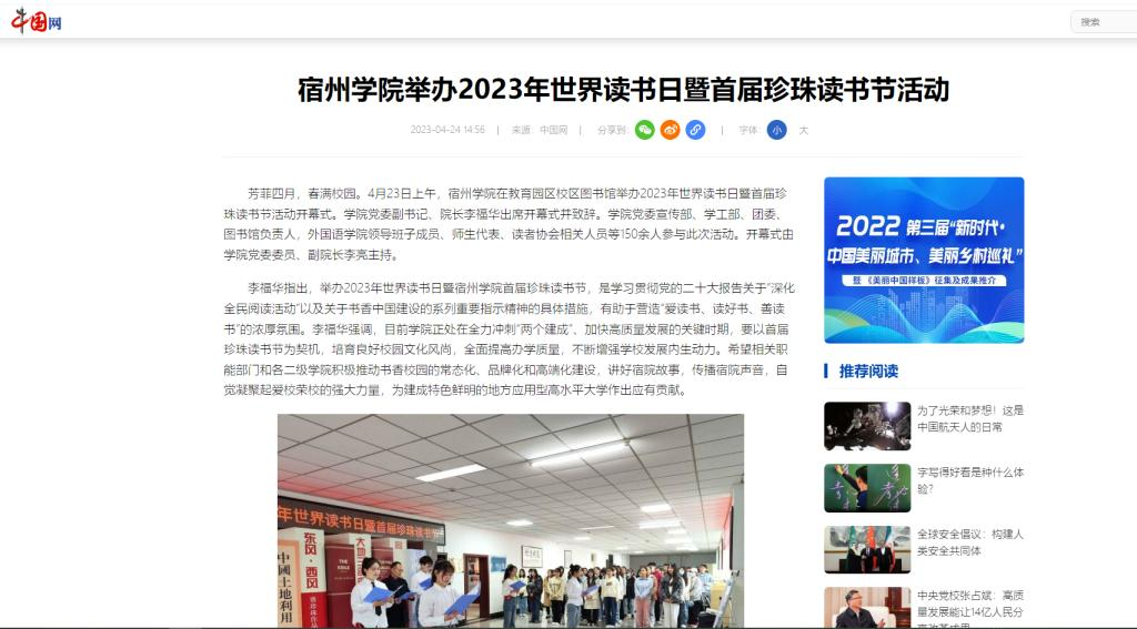 围绕“皖北大地的诺奖明珠”主题,承办宿州学院首届珍珠读书节。以“读书工程”为抓手,以首届珍珠读书节为契机,培育良好校园文化风尚,引导师生在文化交流和文明互鉴中坚定文化自信,讲好宿院故事,传播宿院声音,自觉凝聚起爱校荣校的强大力量。