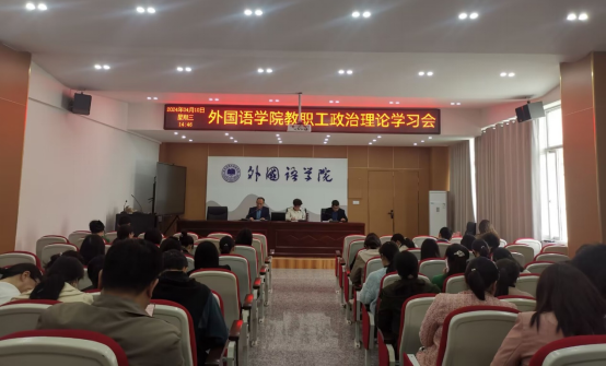 4月10日下午,外国语学院在逸夫楼一楼会议室召开教职工政治理论学习会,党委书记郝景东主持,学院全体教职工参加会议。