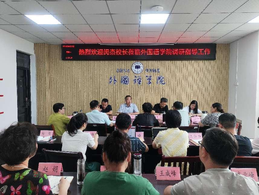 6月17日下午,党委副书记、校长闵杰实地调研外国语学院,科研处处长朱光、教务处处长陈松陪同调研。调研座谈会在外国语学院318会议室召开,外国语学院科级以上干部、各教研室主任及辅导员参加了调研座谈会。