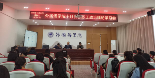 10月23日下午,外国语学院在逸夫楼一楼会议室召开全体教职工大会,开展政治理论集中学习,党委书记郝景东主持。