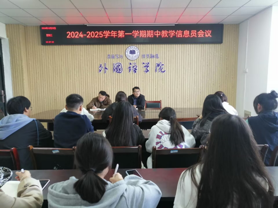 为了进一步强化学生参与教学管理的力度,并提升教学质量监控及信息反馈的即时性和效率,外国语学院于2024年10月30日中午13:00,在逸夫楼A318会议室召开了2024-2025学年第一学期期中教学信息员会议。本次会议由外国语学院院长胡永近教授主持,实习实训中心主任王培培老师、教务员李静静老师及各班教学信息员参会。